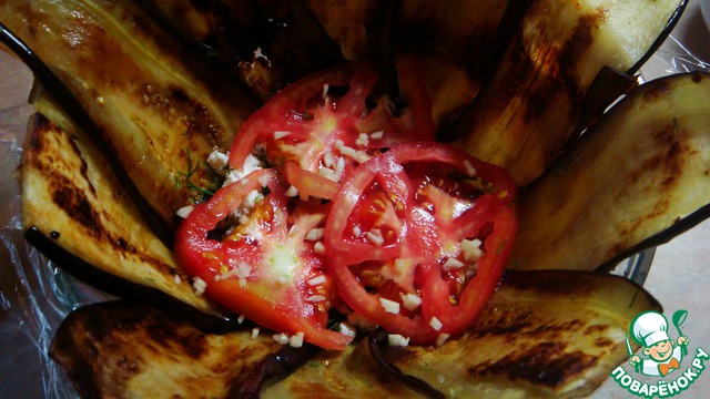 На баклажаны положить немного брынзы, посыпать её укропом. Потом — слой помидоров. Посыпать чесноком.