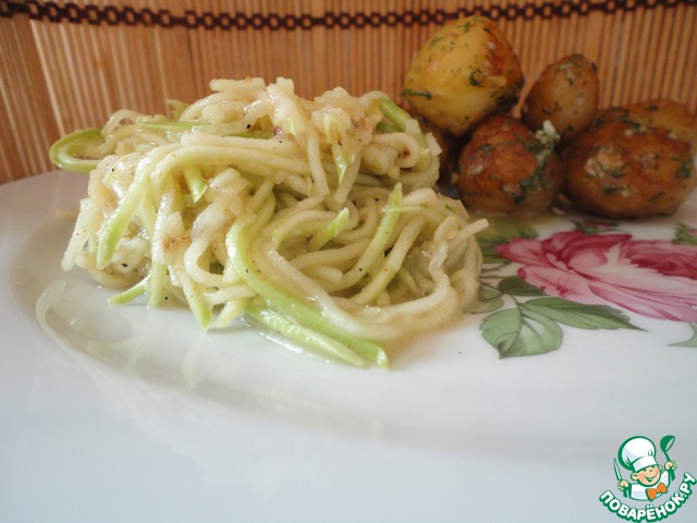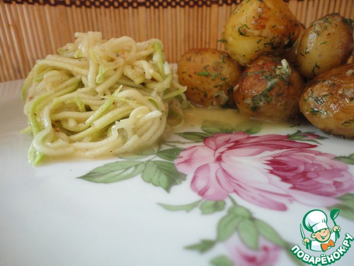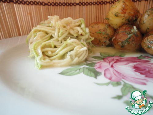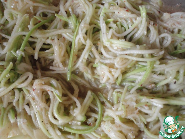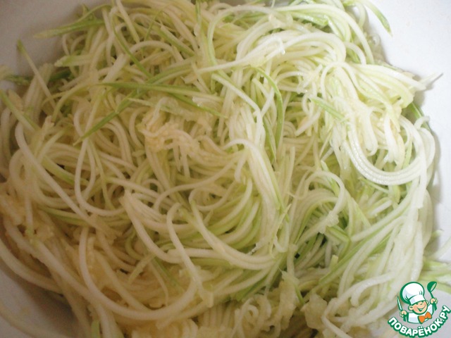 Кабачок трем на терке для корейской моркови. Трется он гораздо быстрее моркови, единственно, что самую серединку, там где косточки, мне потереть не удалось.