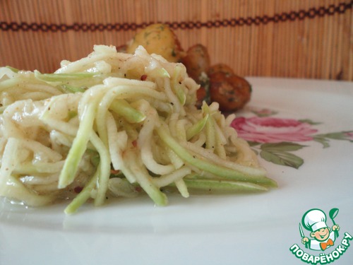 | Еще один "кабачковый" рецепт в сезон кабачков. Я нашла эти кабачки именно под таким названием, хотя по способу приготовления я бы их, пожалуй, назвала "Кабачки по-корейски". Но суть не в названии, а в том, что это вкусно! А еще готовится такая закусочка очень быстро (у меня это заняло 15 минут), не считая времени на маринование. |