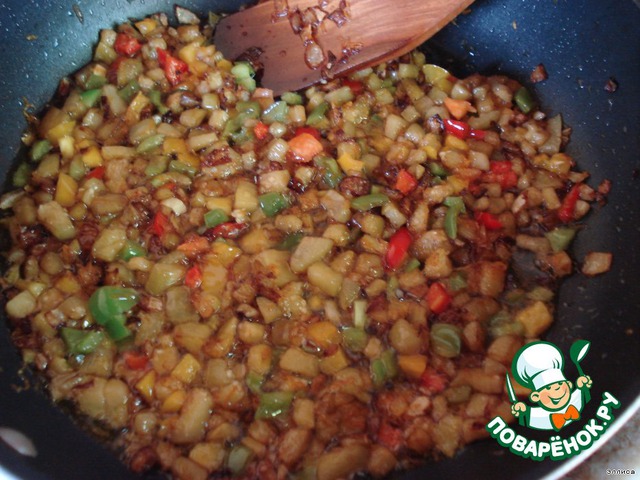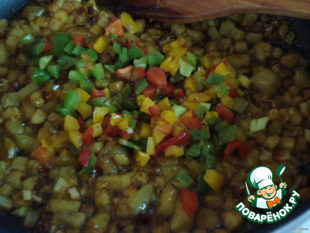 К луку и моркови добавляем баклажаны и нарезанный кубиками сладкий перец.
