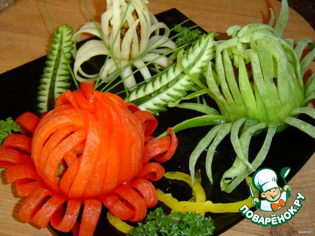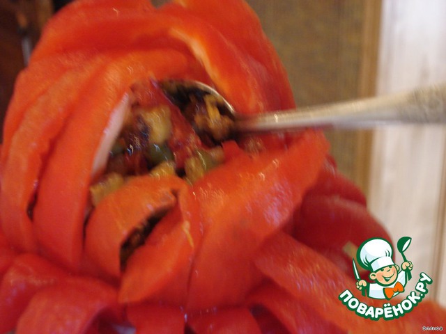 Процесс изготовления цветов из перца я не буду подробно описывать, так как Вы можете познакомиться с ним здесь - http://www.povarenok.ru/recipes/show/16781/