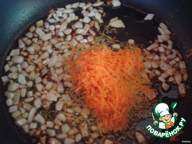 Нарезаем мелко лук, натираем на терке морковь и обжариваем на растительном масле.