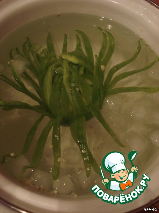 Помещаем перец в ледяную воду и отправляем в холодильник на 1-2 часа, чтобы перец приобрел вид цветка.