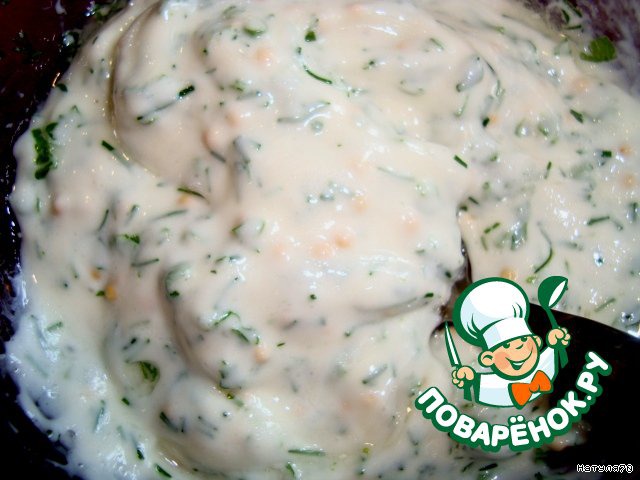 Приготовить соус. Взбить сметану, майонез и 2 ст.л. вина. Добавить мелконарубленную зелень петрушки и укропа, измельченный чеснок и семя горчицы. Соль добавьте по вкусу.