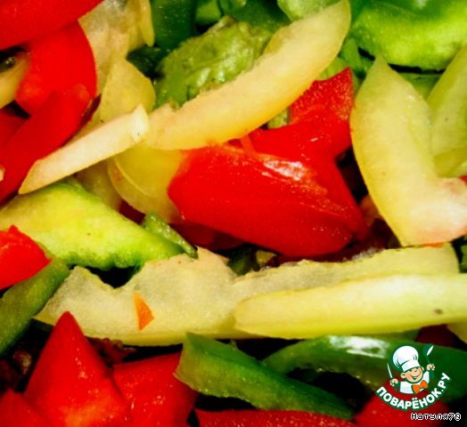 Теперь заправляем соусом нарезанные болгарские перцы и выкладываем в корзиночку!