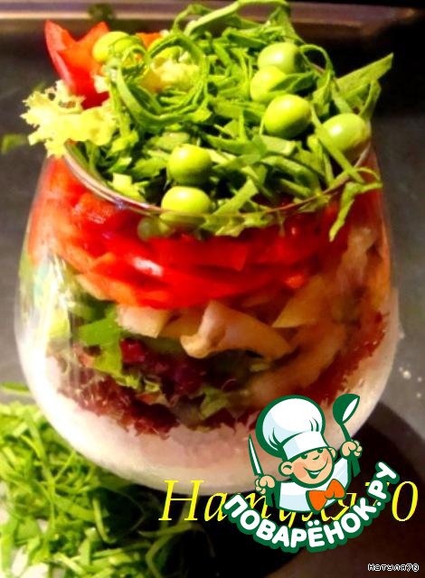 Затем, на лед выкладываем листочки салата. Лед должен быть полность закрыт. На салат выкладываем слоями перец - зеленый, желтый и красный. Каждый слой смазываем соусом. Листья шпината сложить друг на друга, плотно скрутить в трубочку и нарезать тонко "лапшой". Украсить верх закуски шпинатом и горошком.