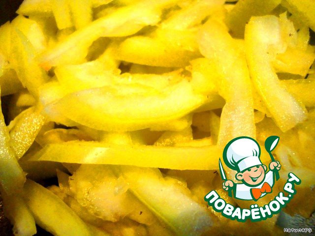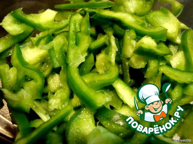 Перцы - красный, желтый и зеленый - нарезаем тонкой соломкой