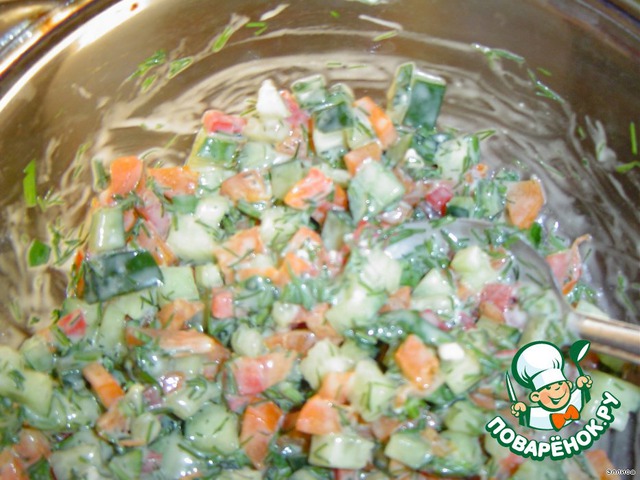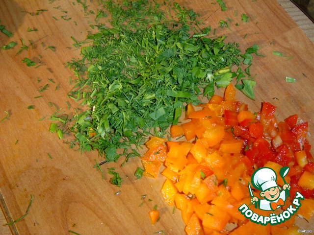 Нарезаем болгарский перец разных цветов мелкими кубиками.Также измельчаем зелень(укроп,петрушку,кинзу).