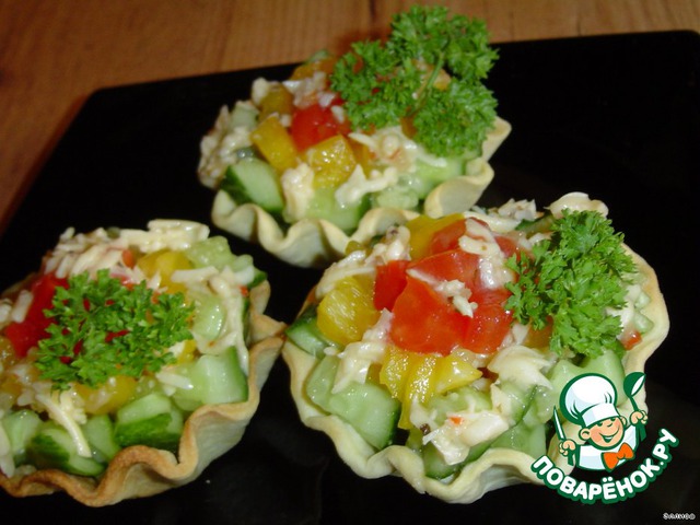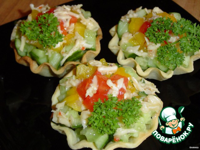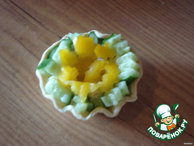 А теперь наполняем корзиночки. Первым слоем выкладываем огурцы, а на них соус.