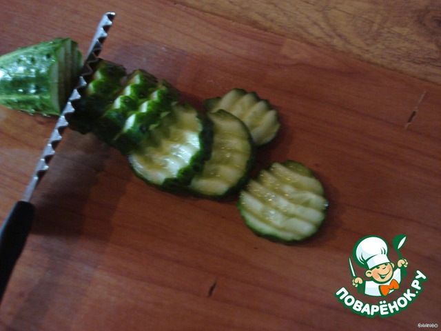 Берем огурцы и с помощью волнистого ножа нарезаем небольшими кусочками.