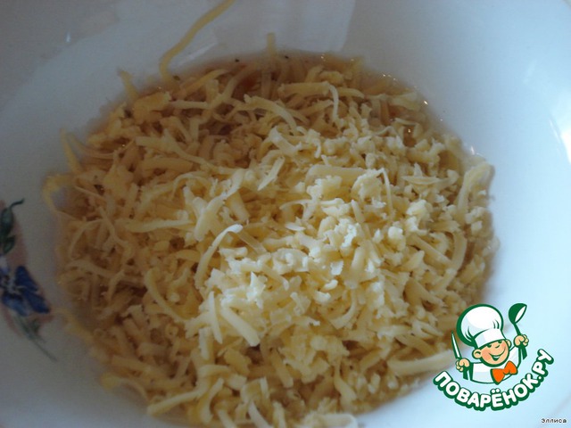Измельчаем чеснок, натираем сыр и добавляем все это к приготовленной смеси. Тщательно перемешиваем.