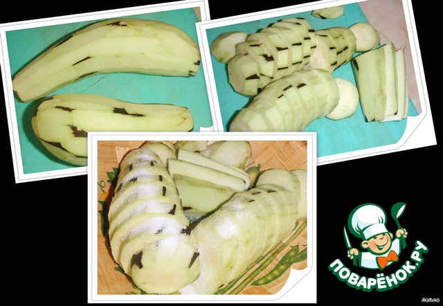 Баклажаны очищаем, разрезать на "медальоны", насыпать соль, дать стечь горечи.