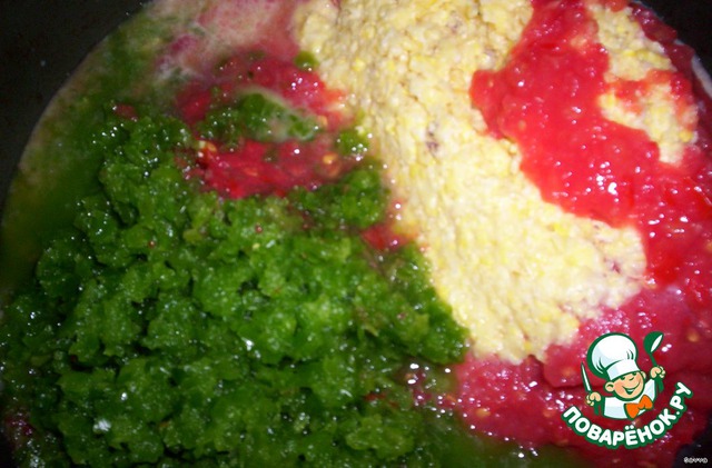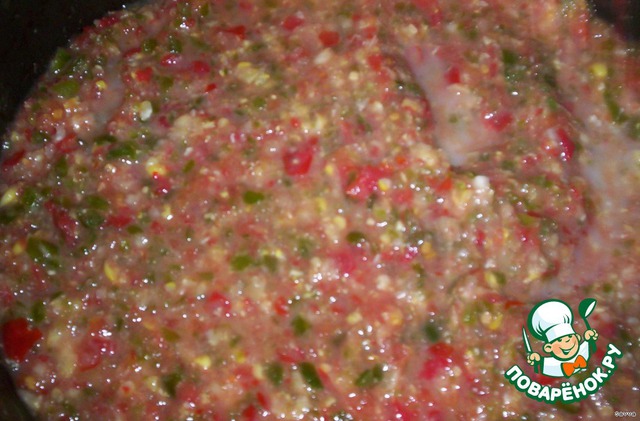Помидоры, перец, чеснок прокрутить на мясорубке, соединить с кукурузой.