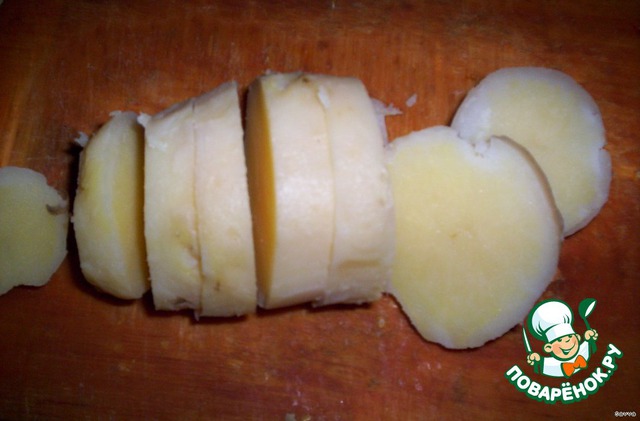 Картофель порезать на пластины, чуть -чуть посолить.