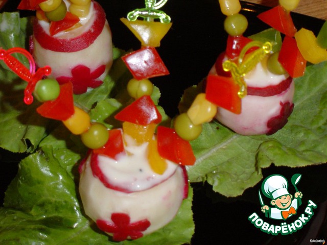 Этим соусом наполняем горшочки из редиса. На шпажки или зубочистки нанизываем поочередно кусочки сладкого перца, горошек и кукурузу.