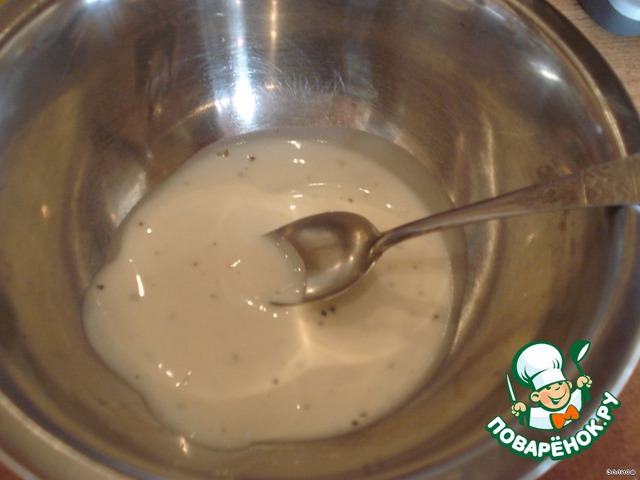 Готовим соус. Для этого смешиваем майонез, сметану, добавляем порошкообразный лук и чеснок (по вкусу), а также смесь сухих трав. Соус готов.