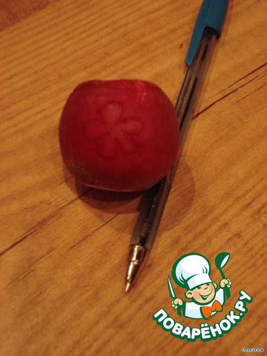 Низ редиса немного обрезаем, чтобы он мог стоять. На поверхности редиса рисуем небольшие цветочки и проводим, немного отступив от края , окружность по верхнему краю заготовки.