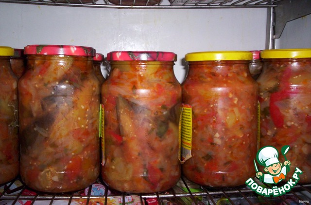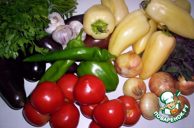 - для приготовления консервов понадобится: помидоры-3кг.,лук-2кг.,баклажаны-2кг.,перец-2кг.,масло подсолнечное -3стакана,чеснок-200гр.,сахар-2ст.л,соль-2ст.л,горький перец- 2шт.,зелень-2пучка