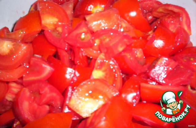 - помидоры порезать на 4 части, чуть-чуть придавить руками , что бы выдавить сок
