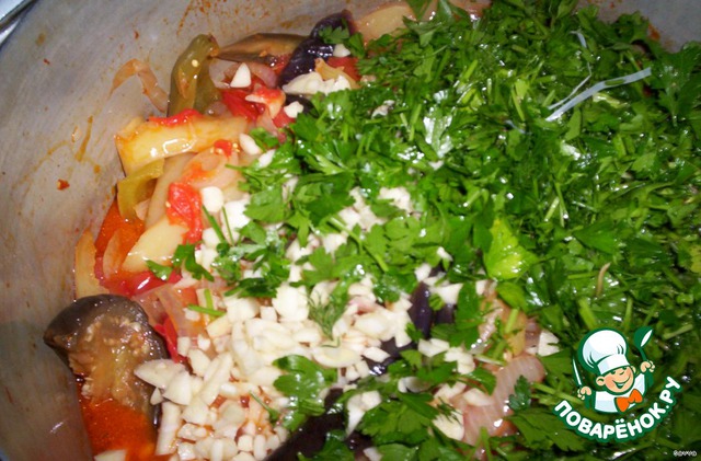 - добавить болгарский перец, горький перец , зелень, чеснок, перемешать, протушить 10 минут