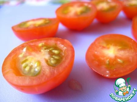 Черри вымыть, обсушить и разрезать на половинки.