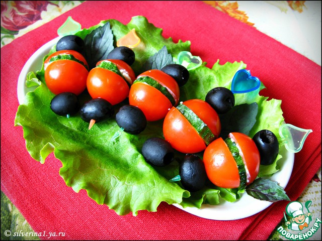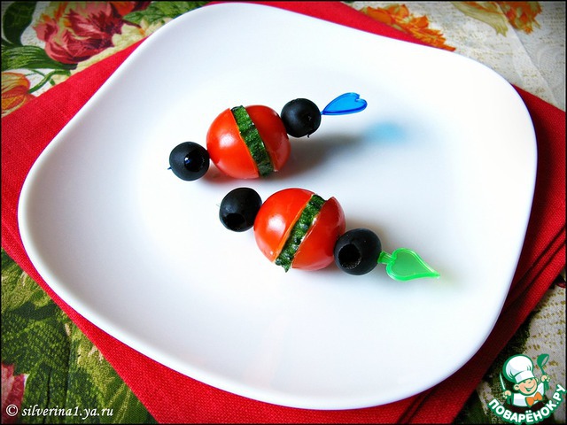Собрать черри с огурцом, как показано на фото: половинка черри, кружочек огурца, снова половинка черри.