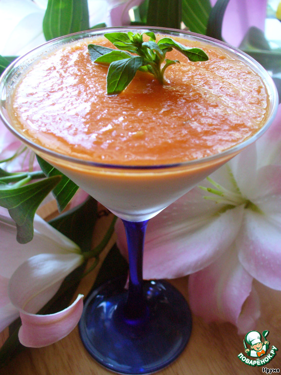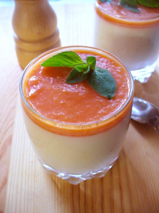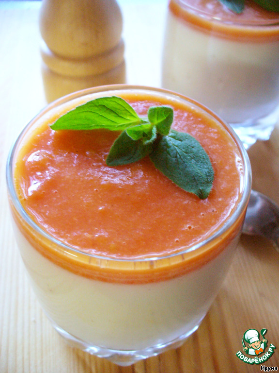 Спустя 4 часа панна котта уже застыла. Заливаем ее тонким слоем томатного соуса. Украшаем сверху зеленью. Я украсила душицей.
