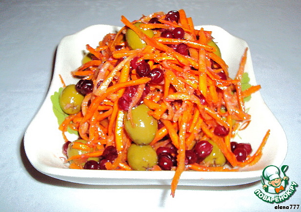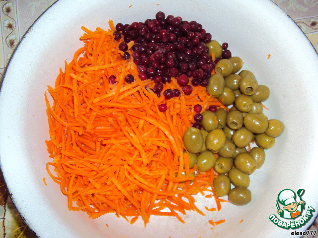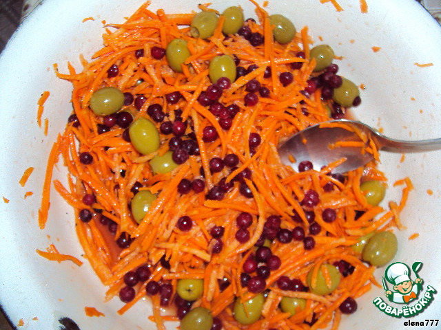 Морковь натереть на тёрке, добавить оливки и бруснику.