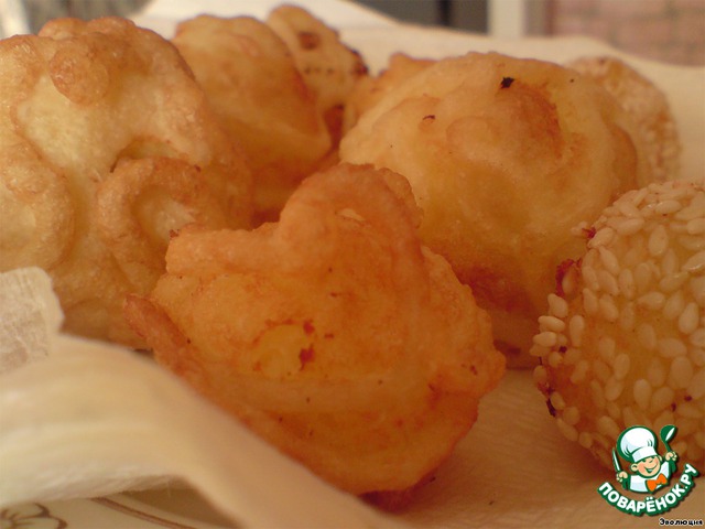 Обжаренные шарики-фонарики кладем на бумажную салфетку, дабы избавиться от лишнего жира. Шарики обжарились по-разному: какие-то больше обжарились сами, у каких-то больше обжарилось тесто.