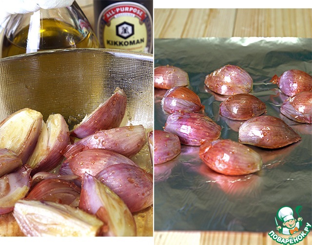 Лук избавляем от корешков, по необходимости очищаем от шкурки, но обязательно часть оставляем!!! Смешиваем с маслом, сахаром и соевым соусом (тут на самом деле количество по вкусу, а можно еще и специями какими-то присыпать), за тем выкладываем вверх шкуркой.