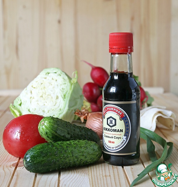 И так, нам понадобятся овощи: молодая капуста, редис, огурец и помидор, а так же соевый соус (ТМ Kikkoman), зеленый лук, сметана и лаваш.