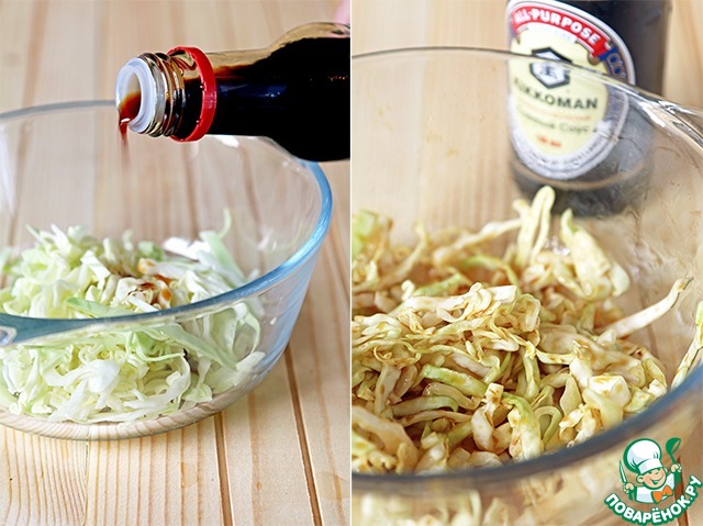 Тонко нарезаем капусту, смешиваем с соевым соусом и немного разминаем рукой.