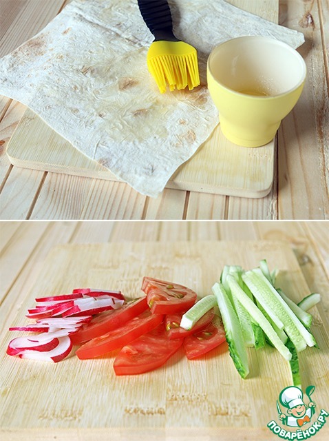 Теперь разрезаем лаваш на 2 порции, растапливаем сливочное масло и промазываем им лаваш: это будет препятствовать его размягчению от овощного салата.