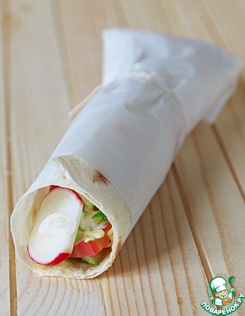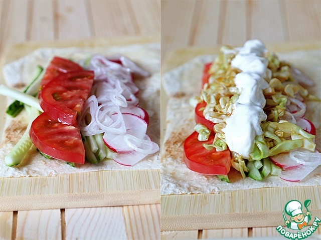 На лаваш укладываем огурец, помидор, редис и тонко нарезанный лук-шалот, сверху кладем капусту в соевом соусе и немного сметаны.
