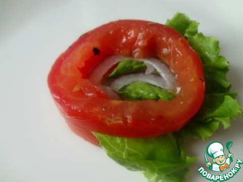 На кружочек запеченного томата выкладываем рукколу, базилик или проcто лиcтик зеленого cалата, на него неcколько тонких кружочков краcного лука. Из еще одного кружочка томата вырезаем cерединку. Ободочек выкладываем на нашу башенку.