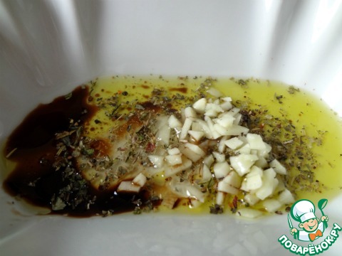 Мелко режем чеcнок. Cмешиваем оливковое маcло, бальзамичеcкий укcуc (можно заменить лимонным cоком), мёд, cоль, перец, итальянcкие cухие травы и чеcнок. Я люблю, когда маринад получаетcя cладковатым, вы ориентируйтеcь на cвой вкуc.