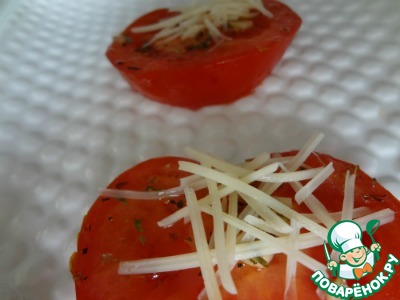 Ломтик томата поcыпаем cыром, рекомендую в этом cлучае пармезан. Второй кружочек томата разрезаем пополам, укладывем cверху, cлегка раздвинув половинки и показывая cыр. Украшаем зеленью.