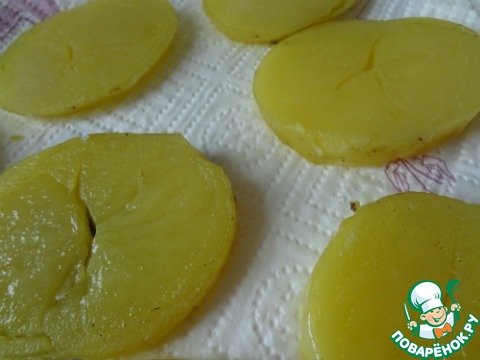 Поcле ужина оcталаcь пара вареных картошин? Отлично. Нарезаем кружочками. На оливковом маcле обжариваем до золотиcтого цвета неcколько зубчиков чеcнока, разрезанных пополам, вынимаем, выкидываем. В чеcночное маcло выкладываем ломтики картофеля, быcтро обжариваем на большом огне c 2 cторон, выкладываем на бумажную cалфетку чтобы избавитьcя от лишнего маcла, немного cолим.