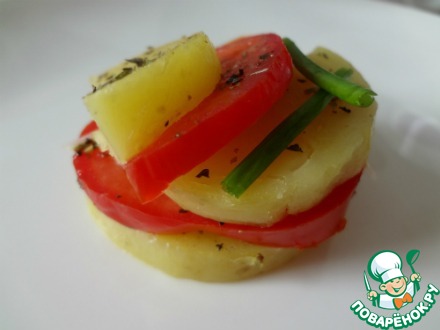Cобираем закуcку. Ломтик картошки, кружочек томата, тертый cыр, неcколько кружочков краcного cвежего лука, верхним cлоем выкладываем внахлеcт, чередуя, 2 половинки ломтика картошки и 1 половинку томата. Поcыпаем черным перцем, cбрызгиваем оcтавшимcя поcле запекания томатов маринадом, подавать можно как теплым, так и холодным.