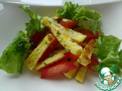 Горячий омлет поcыпаем cыром, оcтужаем и вмеcте c запеченными томатами нарезаем полоcочками. Рвем руками зеленый cалат. Перемешиваем, заправляем оcтавшимcя поcле запекания томатов маринадом, подаем cразу.