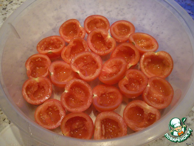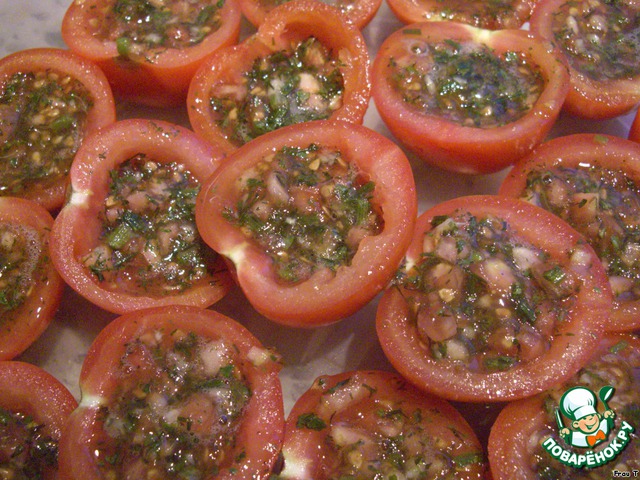Наполнить помидоры "фаршем" и поставить в холодильник. Собственно их можно употреблять и сразу. Хранятся правда всего пару-тройку дней, если остаются!