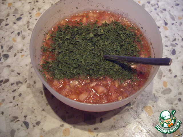 Нарезать мякоть на мелкие кубики, добавить соль, перец, сахар, петрушку, укроп, раздавленный через чеснокодавилку чеснок. Вот здесь в добавках дело вкуса - я люблю остренько с кисло-сладким привкусом, поэтому пробуйте и экспериментируйте на ваш вкус. Все перемешать.
