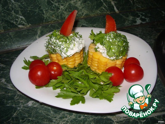 Кукурузу нарезаем на шайбочки. Из творога формируем шарик и обваливаем в нарезанной зелени. Кладем на кукурузку и украшаем помидорками.