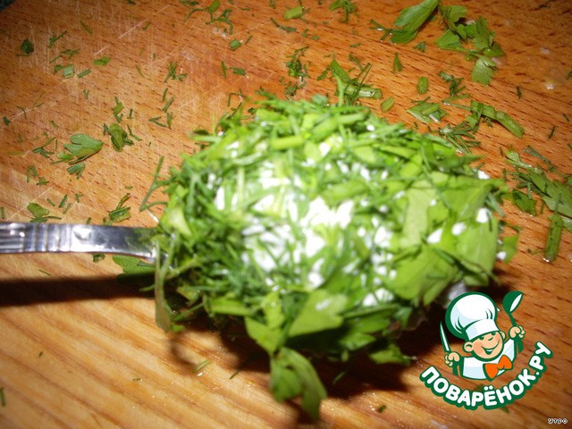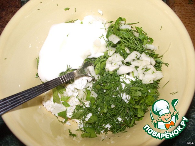 В творог добавляем зелень, измельченный чеснок, столовую ложку майонеза, соль, перец. Перемешиваем.