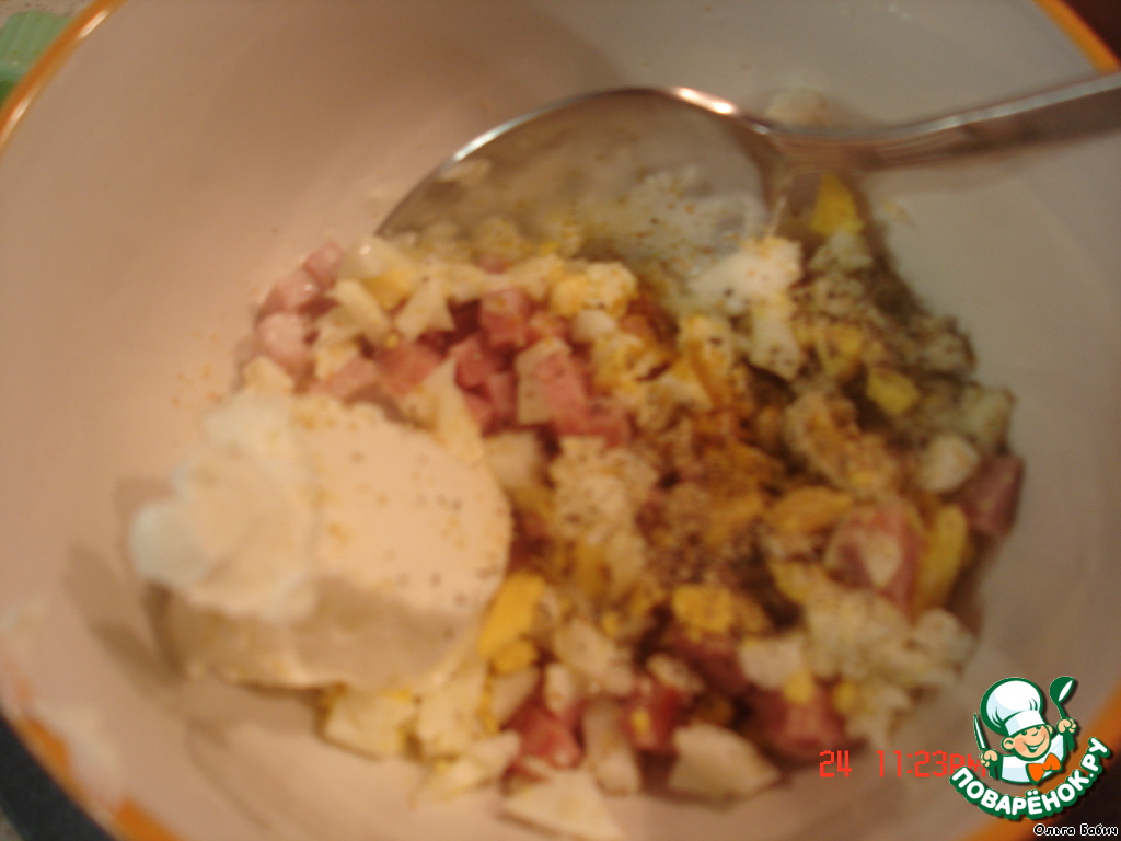смешать яйца, ветчину, сыр, сливки, добавить специи по вкусу, чеснок,