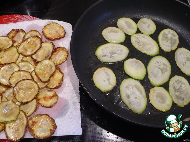 Кабачки нарезаем достаточно тонко, обжариваем на растительном масле до золотистой корочки и выкладываем на бумажное полотенце. Я нарезала буквально чипсы, поэтому обжаривала только с одной стороны. Процесс достаточно нудный - как с блинами, отойти ни на секунду нельзя.