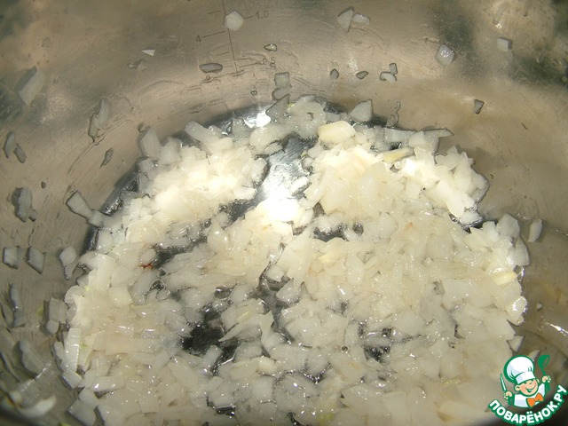 Мелко режем лук и обжариваем в толстостенной кастрюле на растительном масле до золотистого цвета.