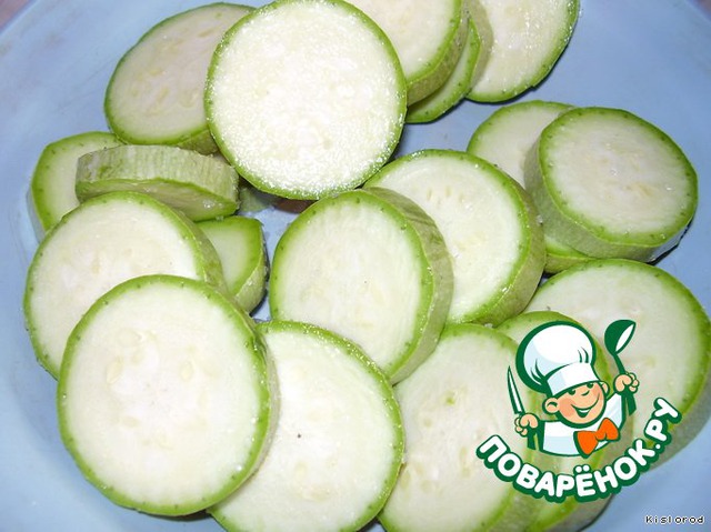 Кабачки моем, режем на кружочки, солим, перемешиваем и оставляем на несколько минуток, чтобы они пустили сок