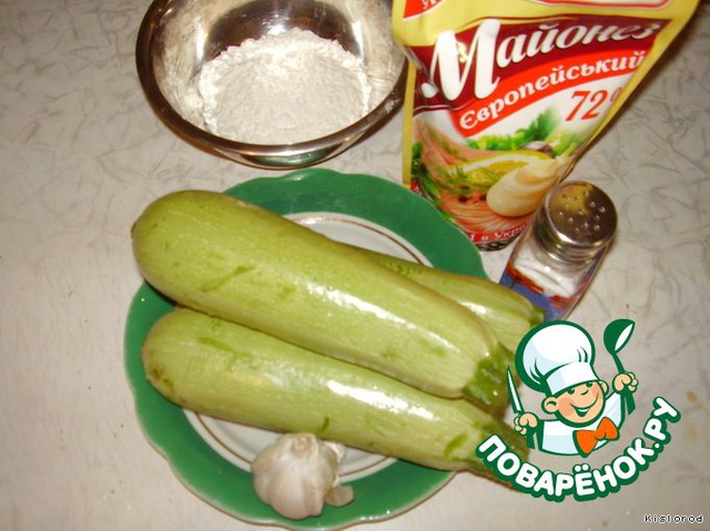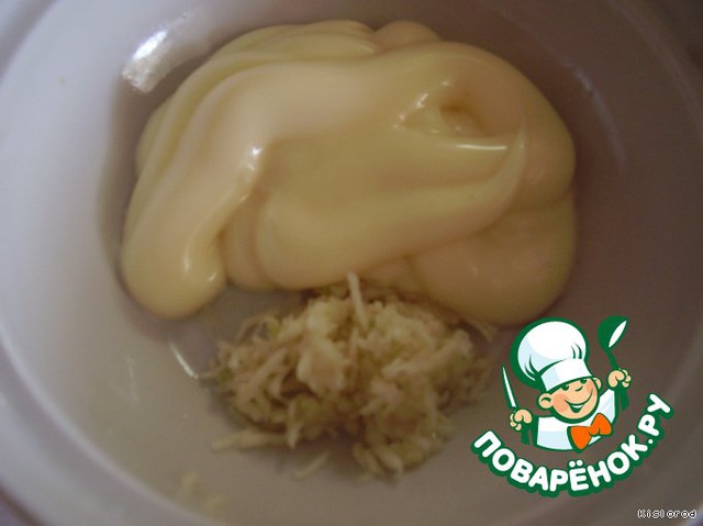 Пока кабачки обжариваются, натираем на мелкой терке чеснок, выдавливаем майонез
