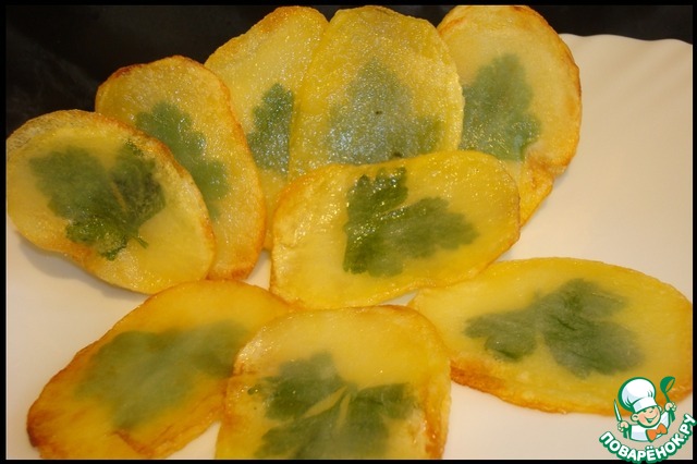 Снимаем на салфеточку. В процессе жарки чипсы вздуются, т. к. масло будет попадать между слоями. Чтобы это исправить, как только мы сняли чипс со сковороды, нужно придавить серединку, чтобы картофель хорошо пристал к петрушке и друг дружке.